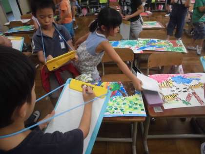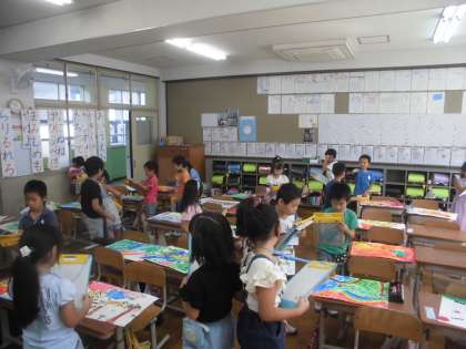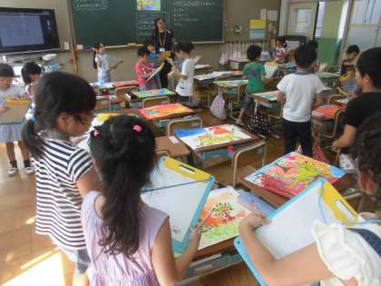 図画工作科「みてみておはなし」の鑑賞会をしました。美術館だと思ってオルゴールの音色を聴きながら鑑賞しました。