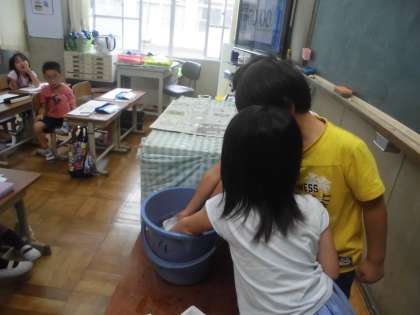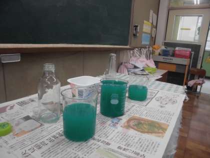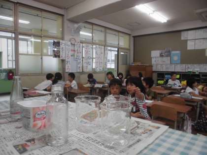 算数科「大きさくらべ(1)」の学習で,かさを比べるためにはどうすれば良いかを考えました。