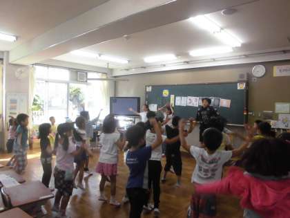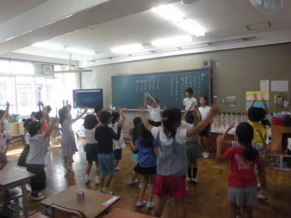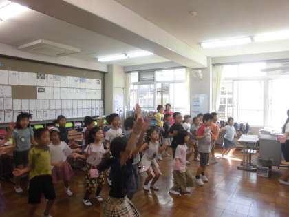 朝の時間に運動委員会の上級生が教室に来て,全校体操を教えてくれました。