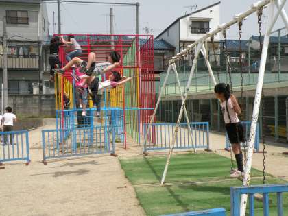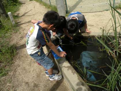 やごを探す子どもたち,遊具で遊ぶ子どもたち,鬼ごっこをする子どもたちなど,友だちと思い思いの遊びをしています。