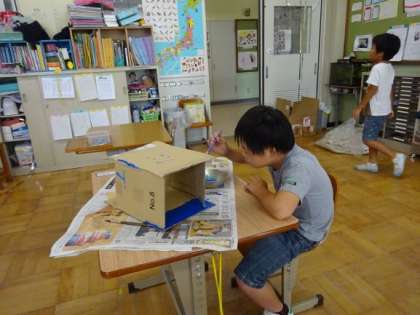 大きな段ボール箱を使って,ロボット作りをします。顔や体の段ボール箱はそれぞれが選び,好きな色で塗りました。そこから牛乳パックや筒で手や足などを付けていきたいと思います。どんなロボットが出来上がるのか楽しみですね。