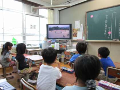当日のビデオをみんなでみました。旗の動きがそろっているところをみて,「きれい〜!」と,つぶやいていました。練習の成果が発揮できて,嬉しく思っています。ありがとうございました。これからの子どもたちの,さらなる頑張りに期待しています!!