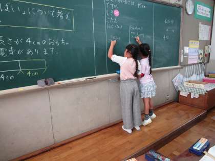 〇の△つ分,〇の△倍を,かけ算の式にして答えを求めています。答えを求めるときは,たし算をしたり,数図ブロックを数えたりしています。また,なぜその式になるのかも,黒板に書いて,みんなに説明することもあります。