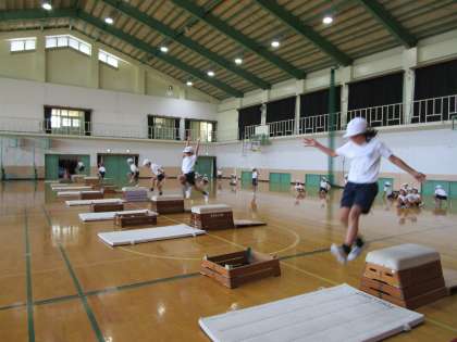 とびばこあそびの学習が始まりました。とびばこを跳ぶときに大事な,着地の練習をしている様子です。「1年生のときよりもできるようになりたい!」と,やる気です!