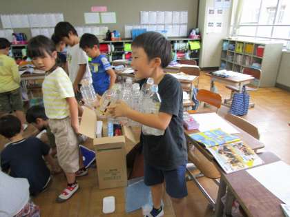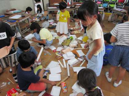 お家から持ってきてもらった材料を,あれこれ組み合わせて試作中です。片付けも大切な時間で,材料を同じものごとに整理しながら,次に使いたいものを見つけています。来週からは,「動くしかけ」を組み合わせて,動くおもちゃを作っていきます。