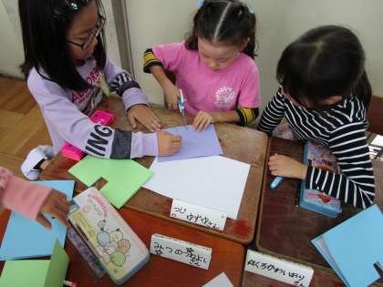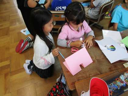 3・4時間目,深草幼稚園のお友だちと交流をしました。国語の学習で作った「しかけカード」の作り方を教えてあげたり,読み聞かせをしたりしました。うまく教えられるか心配していましたが,幼稚園のお友だちが楽しんでカードを作っているのを見て,ホッとしていました。