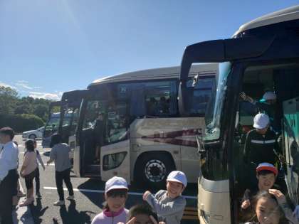 4年生のバスは伊勢道に入り、安濃サービスエリアで休憩です。特にしんどくなった児童もなく、順調です。