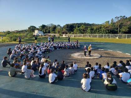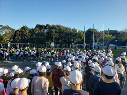 朝の集いは相手の学校に学校の紹介をしました。お互いの校歌を聞き合って、交流しました。