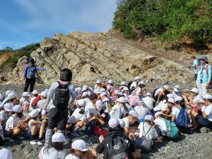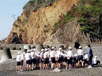 宮崎浜には斜めに傾いた地層が露出しています。高学年の理科では地層を学習するので、林先生からお話を聞きました。