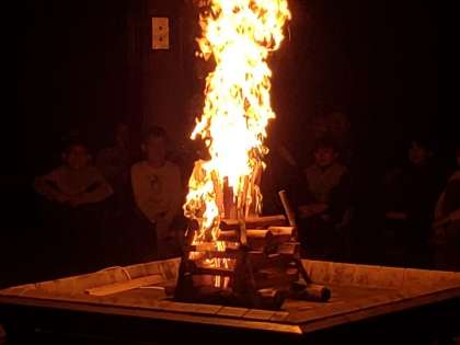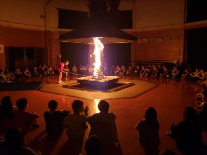 燃えろ燃えろをみんなで歌うと、あら不思議、キャンプファイヤーに火がつきま・・・せんでした。痛恨のマジックファイヤーの設置ミス!でも、すぐに修正して、勢いよく燃え始めました。