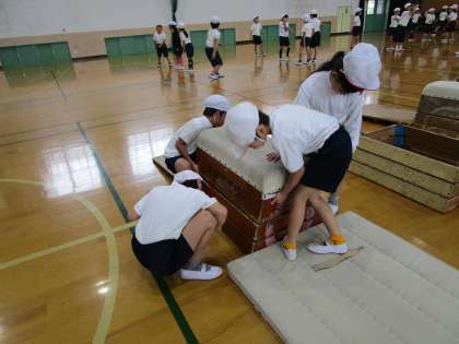 たて・よこの開脚跳びができるように練習しています。跳び箱の段数も自分たちで協力して変えられるようになりました。