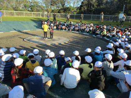 2日目最初の活動の朝の集いの様子です。一緒に行っていた小学校と合同で行いました。学校紹介をしっかりすることができました。