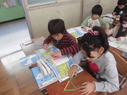 算数科「かたちづくり」の学習では色板から棒にかえて形をつくりました。