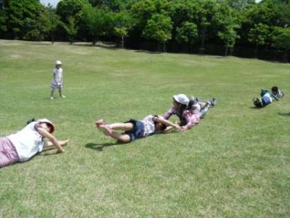 芝生の上で転がったり、おにごっこをしたり、思い思いに考えて楽しく遊んでいました。