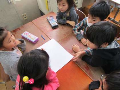 深草商店街のお店にインタビューに行く準備をしています。「どんなことを聞こうかな。」「お店の中ってどうなってるのかな。」など,話し合っています。金曜日を楽しみに頑張っています!!