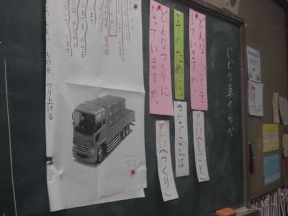国語科「じどう車くらべ」の単元では,自動車の「しごと」と「つくり」に注目して学習しています。