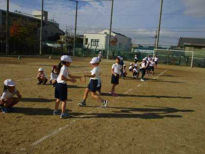 寒くなってきましたが,今日はいいお天気の中,リレーをしました。リングのバトンを次の友だちに渡し,一生懸命走りました。
