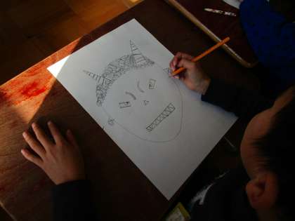 「たのしく うつして」では,紙を重ねて貼ったり,お家で集めた材料を付けたりして『おに』を作ります。今日は,「おに」についてイメージを広げました。「怖いおに」「優しいおに」「つのがある」・・・など,今まで読んでもらったお話などから考えました。スケッチも楽しんで描いていました。