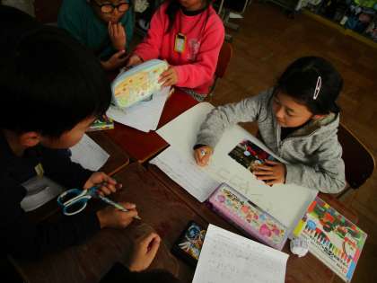 町探検のインタビューで教えてもらったことをまとめて,クラスで紹介します。質問したことや,見たり聞いたりしてビックリしたことを,みんなで相談しながら絵や文で書いています。