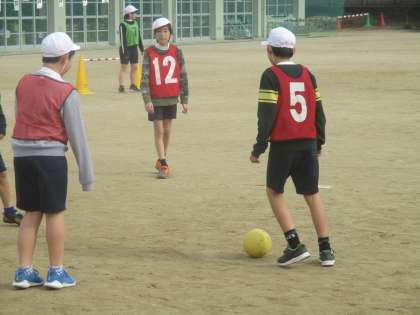 体育科ではサッカーの学習に取り組んでいます。攻め方や守り方を工夫してサッカーを楽しんでいます。