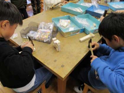 図画工作科では「トントンくぎ打ち名人」に取り組んでおり,初めてのくぎ打ちの経験をしています。くぎを使ってつなげる楽しさを体験しています。