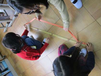 1メートルのものさしを使って,テープを測りました。30センチメートルのものさしをつなげて測るより,長い長さを測るときは1メートルものさしを使った方がいいと,測るものによって道具を変えることの大切さを実感したようでした。