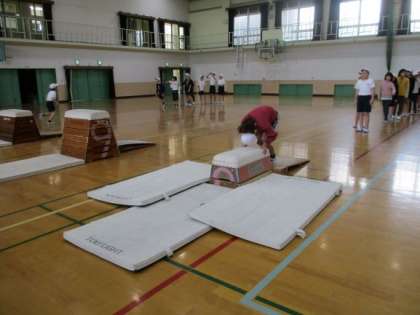 体育の時間にとび箱の学習が始まりました。台上前転やあおむけとびなどをがんばっています。