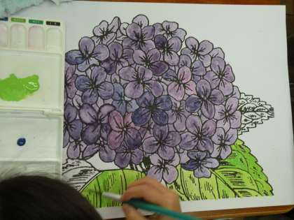 2年生では,絵の具を使って「アジサイ」の彩色をしました。