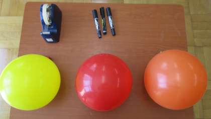 3つの風船を膨らませます。黄色の風船にはセロハンテープを貼る,赤色の風船にはマジックペンで色を塗る,オレンジ色の風船は何もしません。