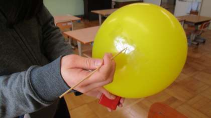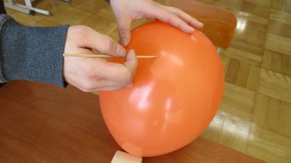 黄色,赤色,オレンジ色などそれぞれの風船に竹串を刺します。