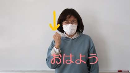 まず1つ目は「おはよう」です。右頬に置いたこぶしを下に向かって動かします。挨拶の時に使えるといいですね。