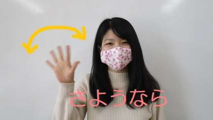 2つ目は「さようなら」です。右手を顔の近くに持って行き,手を横に振ります。お家でも使ってみてくださいね。