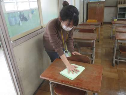 先生は,きょうしつのつくえをぞうきんでふきました。