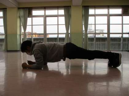 「プランク」という種目で両肘を床につけて,腕とつま先で体重を支えます。