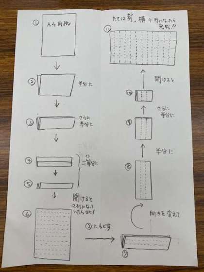 ※白紙のA4プリントを使って効率よく学習する一例を紹介します。図のように縦12列,横4行に折ると練習しやすくなります。
