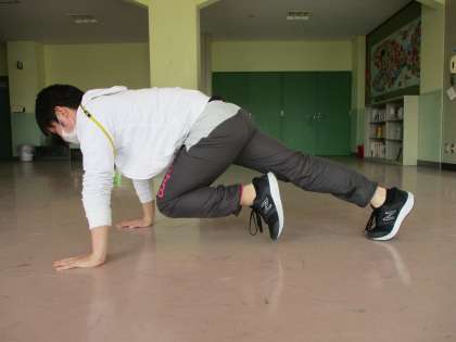 今日は「マウンテンクライマー」という種目です。足が速くなります!