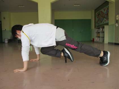 (1)腕立て伏せの体勢になり,肘をまっすぐに伸ばします。