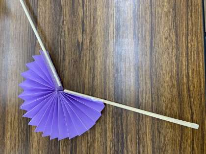 おりがみを,じゃばら折りで3まいおります。それをのりではってわりばしをつけたら完成です!