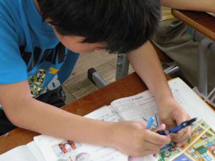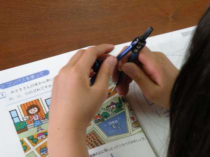教科書のさし絵にある三角池と四角池の周りの長さを比べるためにコンパスを使いました。