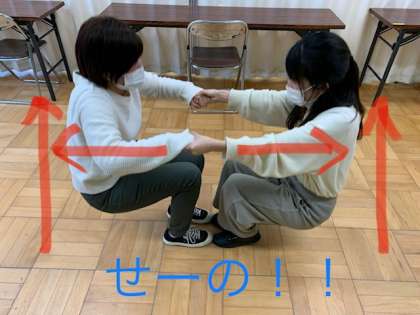 2.二人でいきをあわせて,どうじに立ちます。「せーの!!」