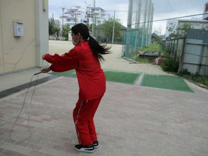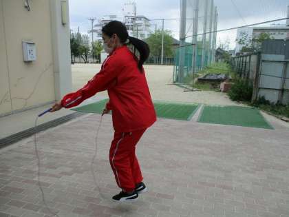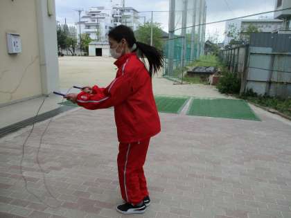 またまた分かりにくいかもしれませんが,後ろとびからの「後ろ交差跳び」「後ろあやとび」です!以外と前とびよりも跳びやすいかもしれません。さあ,あなたもチャレンジ!!