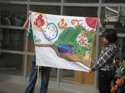 シンボルとなる旗は,キャンプファイヤーの絵や,星空,深草小学校の文字に葉っぱをあしらっていたり,また,山登りの様子や晴れを願って,太陽がかいてあったりします。