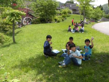 水車小屋の近くに集まっておにぎりをいただきました。