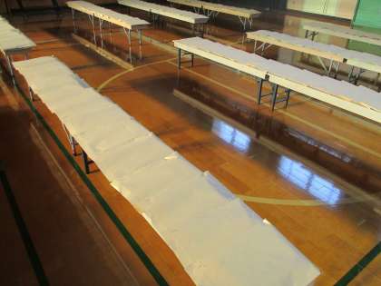 奥に進んでください。クラスごとに長椅子の上に「名簿順」で「封筒」が置いてあります。ご自分のお子様の「封筒」をお取りください。