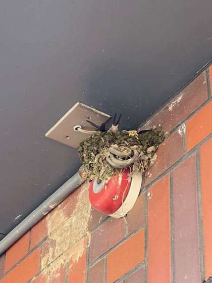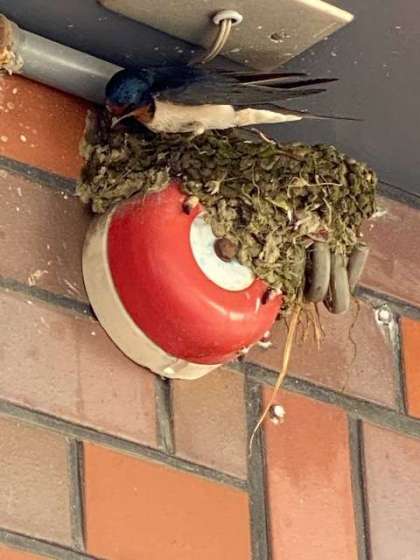 学校近くのお店の軒(のき:屋根の出っぱたところ)にツバメがひんぱんに出入りしています。