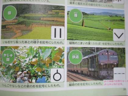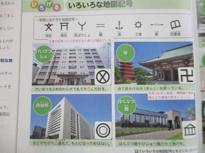 3年生では,「地図記号」を使って「校区地図」を作る学習があります。宿題の中にもありましたね。「地図記号」には,成り立ちの意味があります。たくさん覚えたいですね。