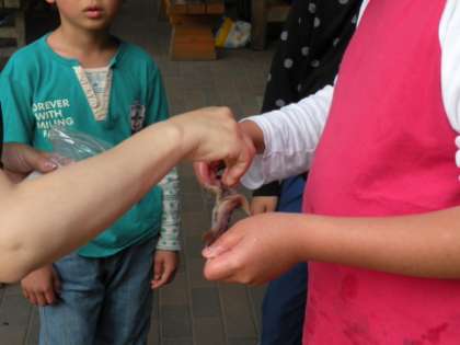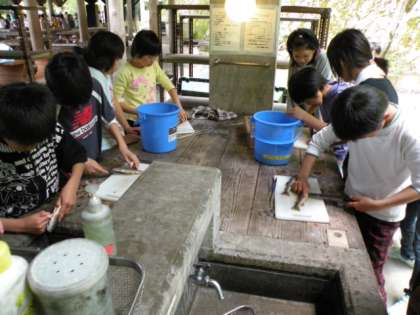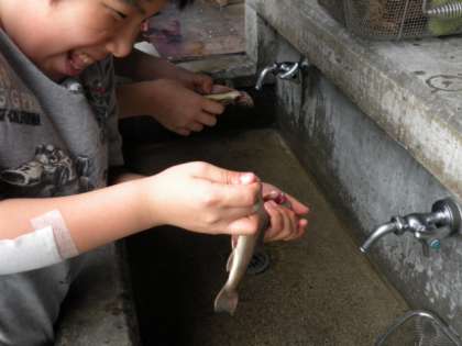 おがま池でつかんだ魚のお腹を包丁で切って内蔵を取り出します。