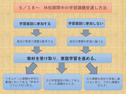 ・学習面談に参加されない児童には,事前に連絡した上で,家庭訪問にて教材をポストに入れさせていただきます。児童がおこなった宿題については担任が見ますので,学校の靴箱付近に設置した「学年ボックス」に入れにきてください。(必ず氏名の記入をお願いします。)