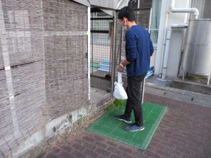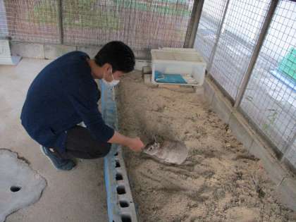 写真はお仕事の一つ,飼育小屋にいるうさぎのリッキーに餌をあげるところです。