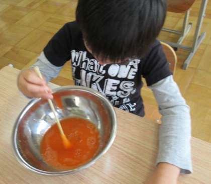 魔法の水を入れてかき混ぜると,どんどん固まって来ました。手で触ってみると,びよーんと伸びたり,ぷつんとちぎれたり,色んな形に変化していて,わかばっこは楽しそうに遊んでいました。